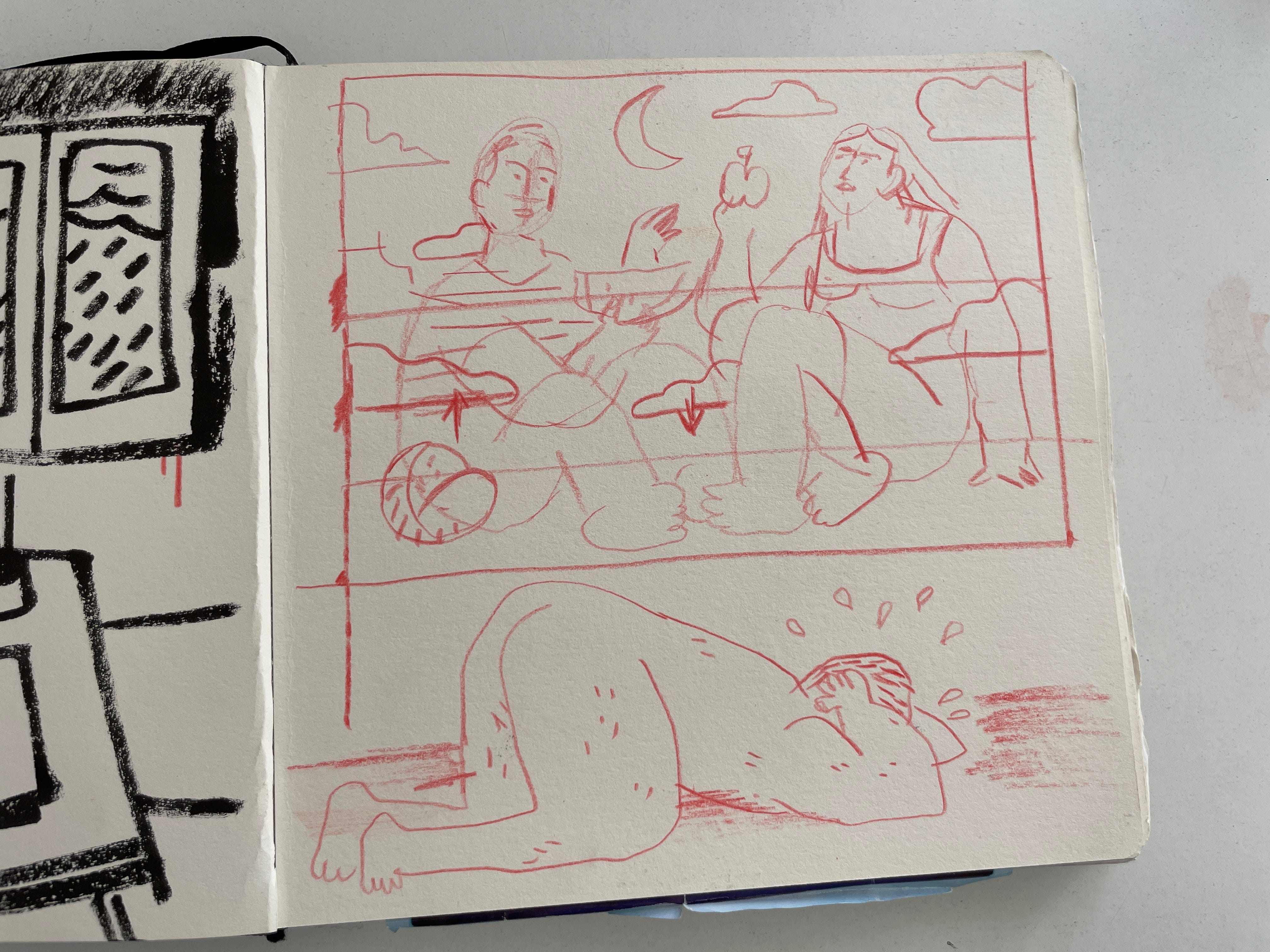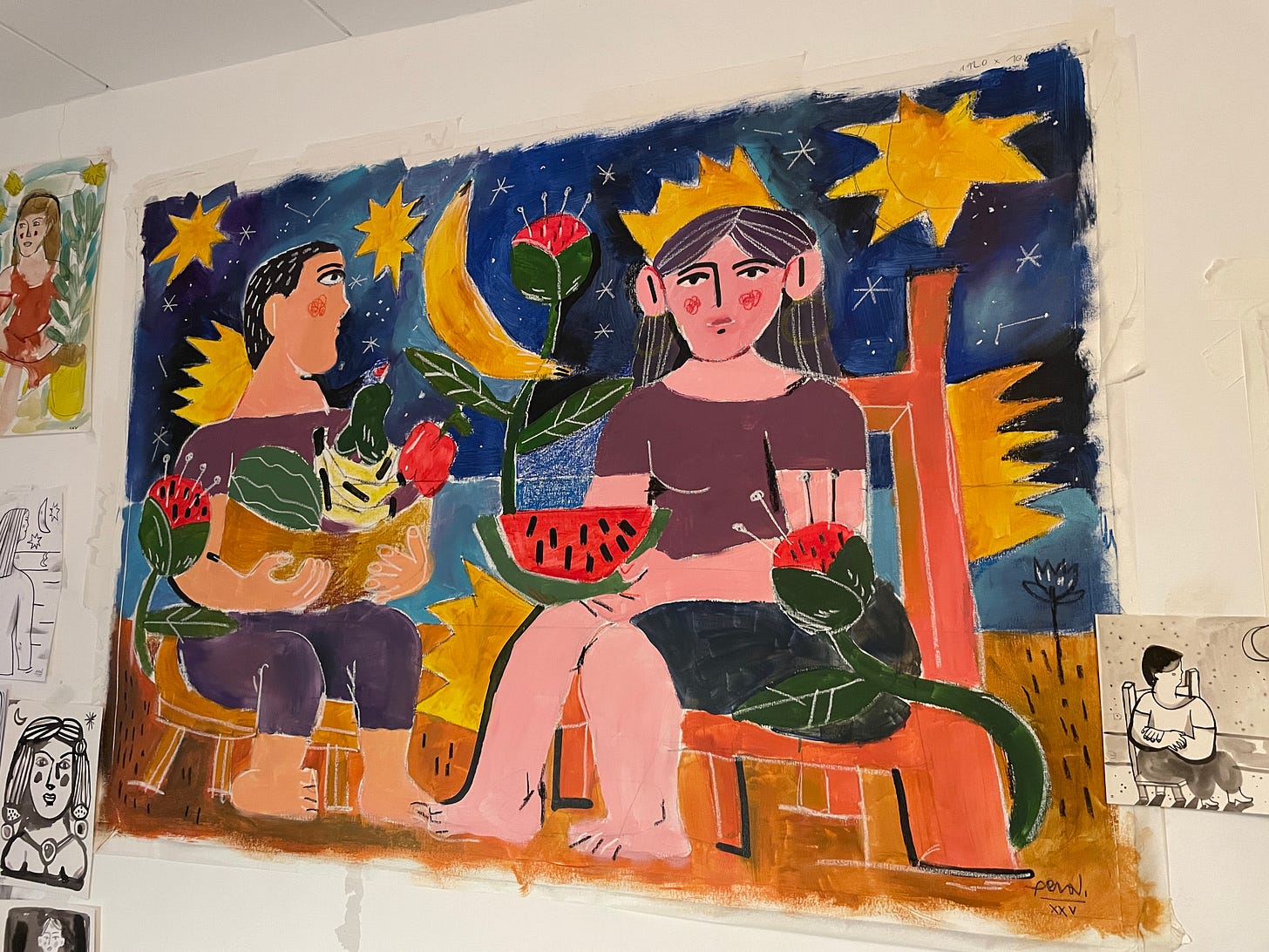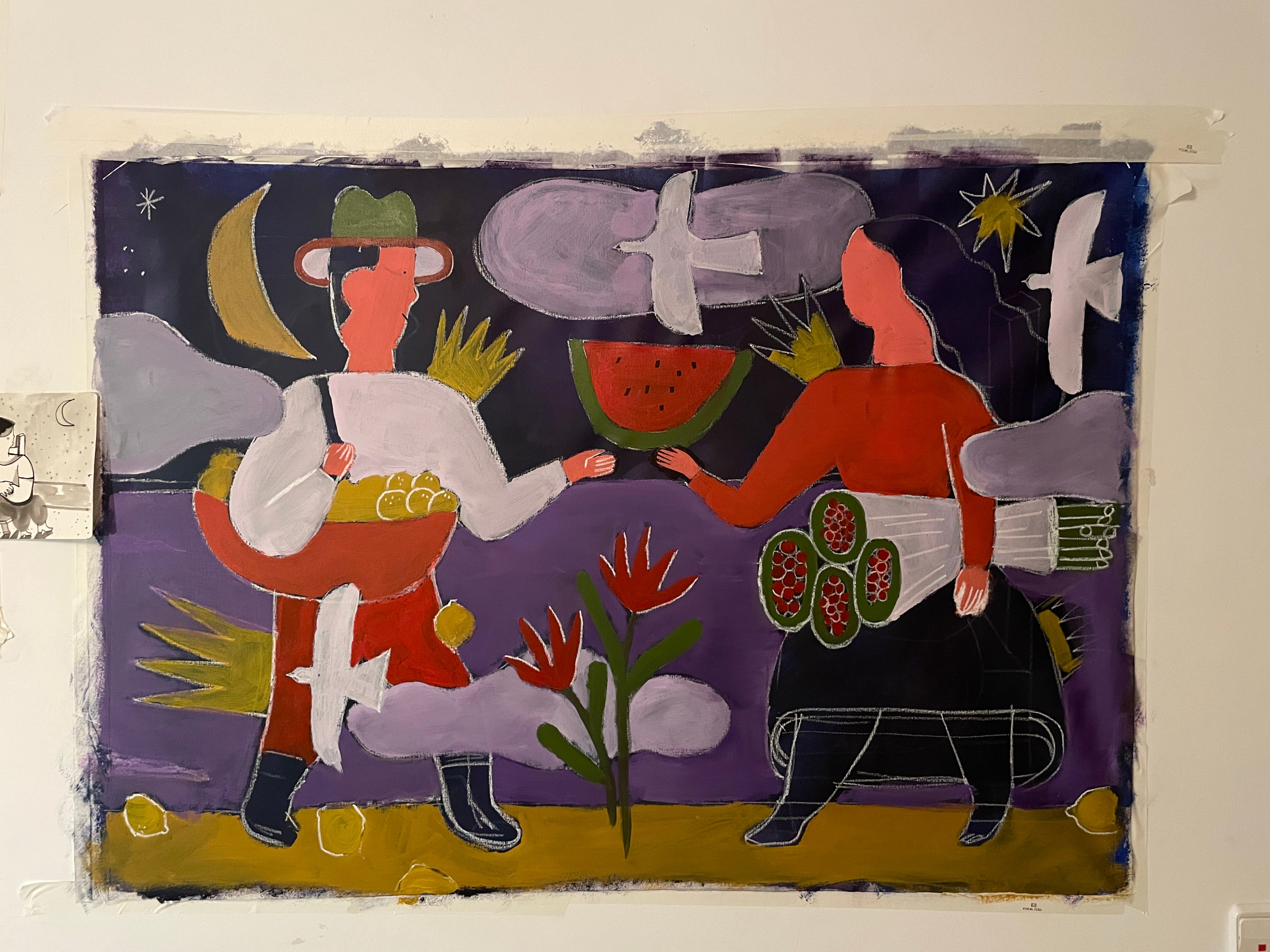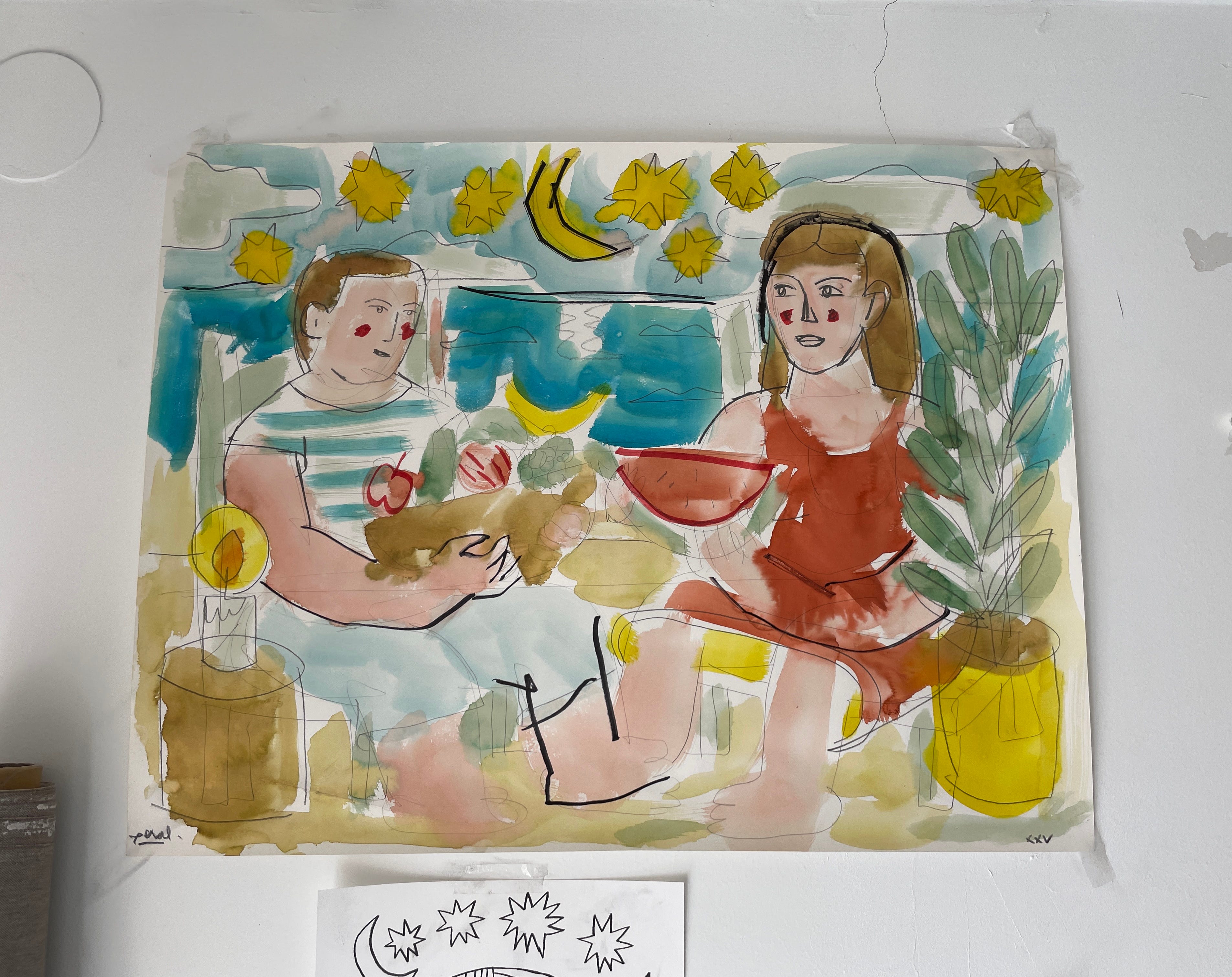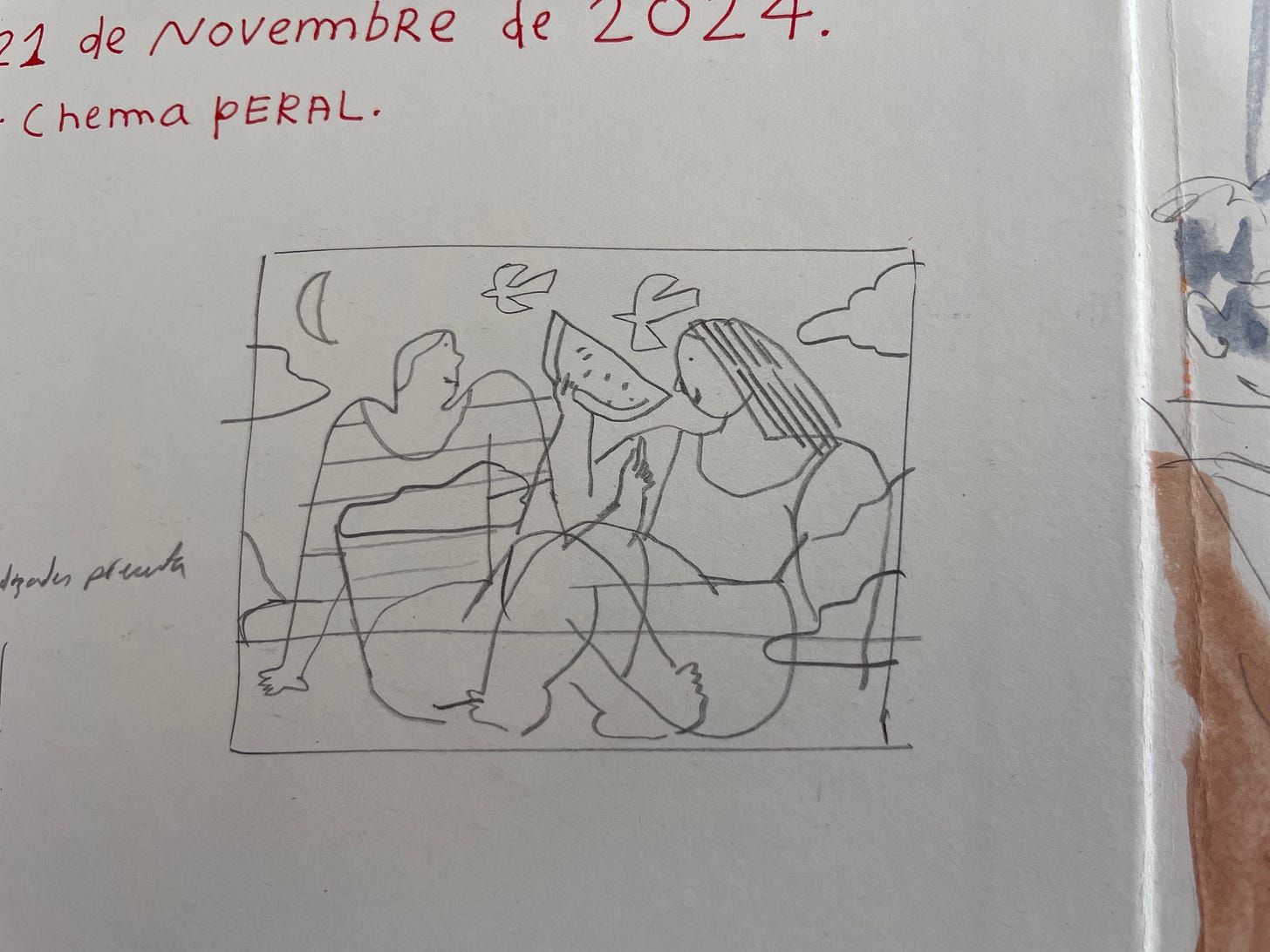 Como ya os comenté en el pasado, tengo un encargo muy grande en todos los sentidos. Se trata de un lienzo de 3 metros de largo por 2 metros de alto. En cuanto me lo encargaron, empecé a hacer bocetos, pero me quedé con la primera idea, una escena de playa, con dos personajes compartiendo fruta.