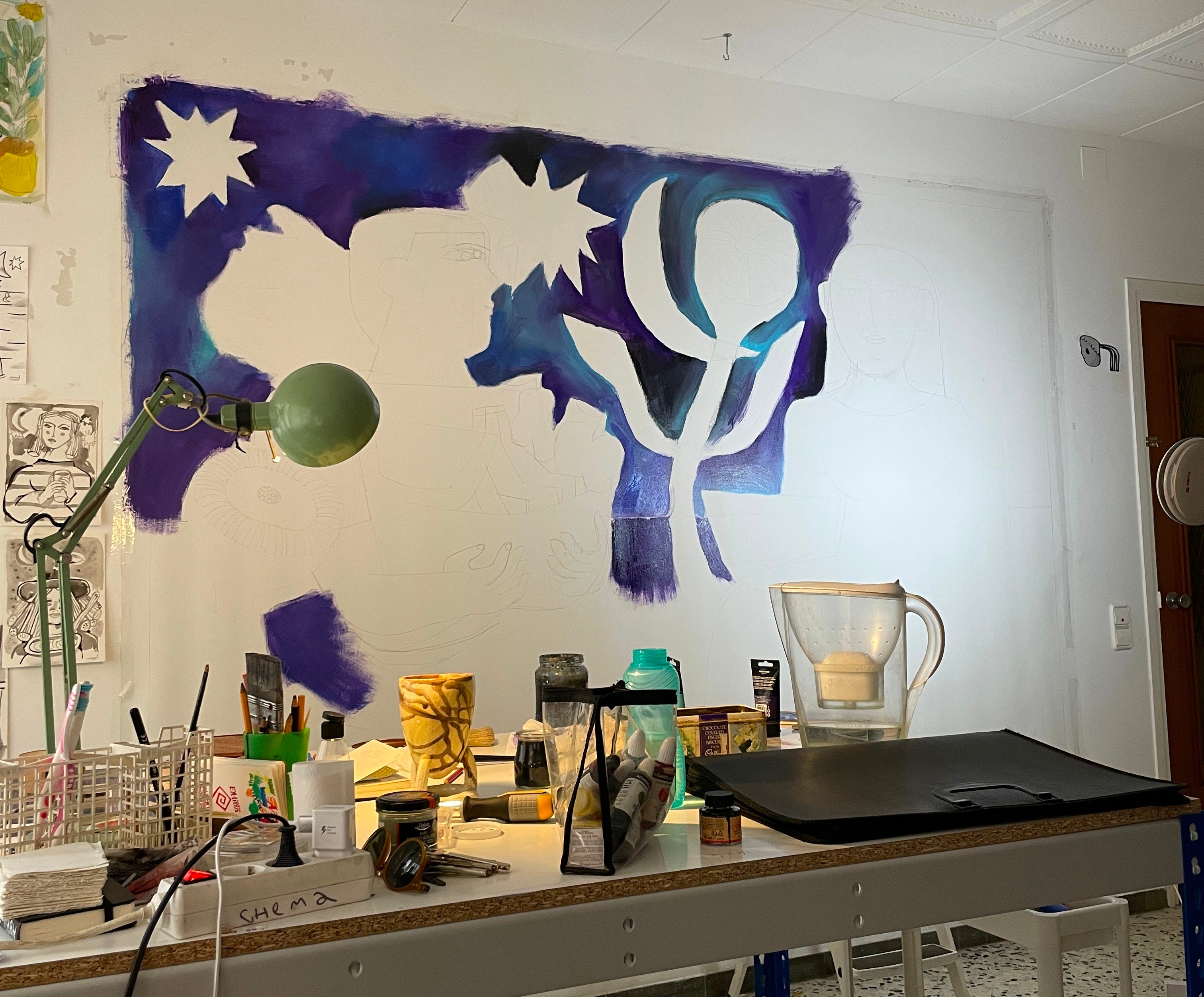 La frustración se fue disipando cuando (sorpresa) empecé a trabajar en la obra final, viendo como mi cuerpo se relacionaba con el lienzo. A mis alumnas del curso de ilustración muchas veces les animo a que dibujen de pie. Para mi hay una linea dentro de las proporciones del formato en el que esté dibujando o pintando, que suelo traspasar, y es darme cuenta de que ya no estoy dibujando solo con la mano, si no con el cuerpo entero. Cuando el papel, o en este caso el lienzo, es grande, uno necesita alejarse para mirarlo, acercarse, cambiar de perspectiva, apoyarse con el cuerpo sobre el mismo lienzo, y eso hace que sea una experiencia física completa.